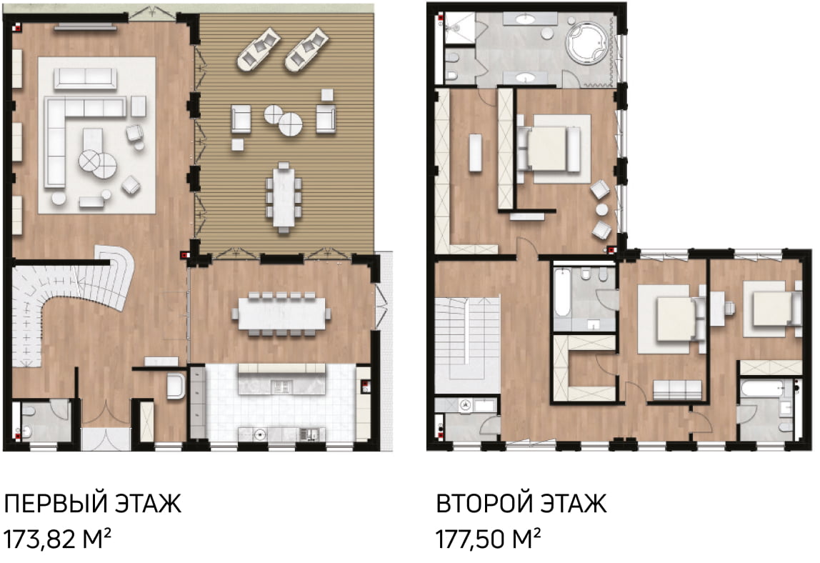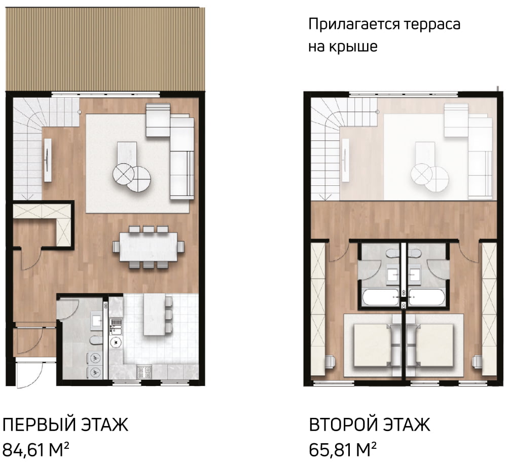 В комплексе Belgravia второй свет представлен в двухуровневых квартирах – над пространством гостиной-столовой, а на втором этаже расположены две спальни. -